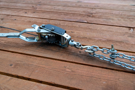 metallic chain handle with red hook in technical room. Crane cargo hook. Concept of maintenance and construction work.