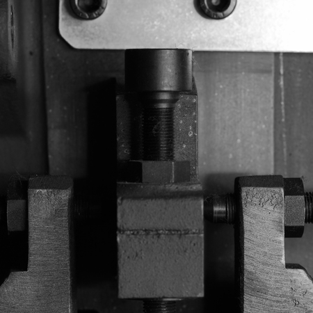 Bronze bolt shaft. Threading die detail in metallic tap wrench with black bolts. Shiny threaded rod in sharp steel cutting tool. Brass part. Accurate chip machining, mechanical engineering metal work.