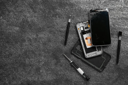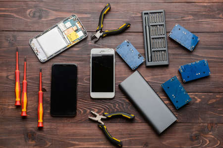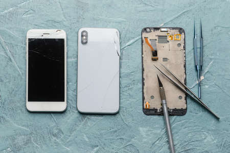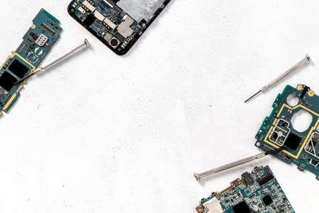 Concept of repair cell phone. Top view different objects of damaged modern smartphone lying on table with copy space in service center