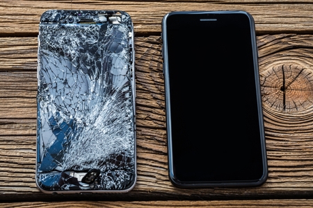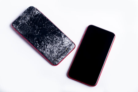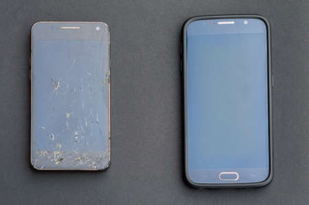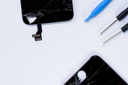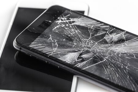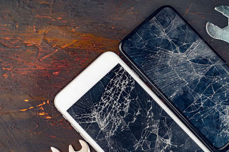 broken smartphone in front of a broken smartphone with broken glass. concept of repair of smartphone.