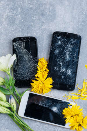 Broken touch and stylish phones lie next to flowers white and yellow on a stone background. Side view