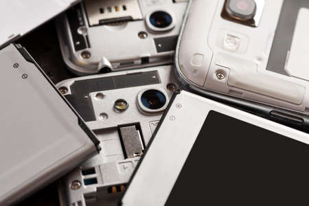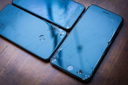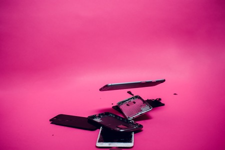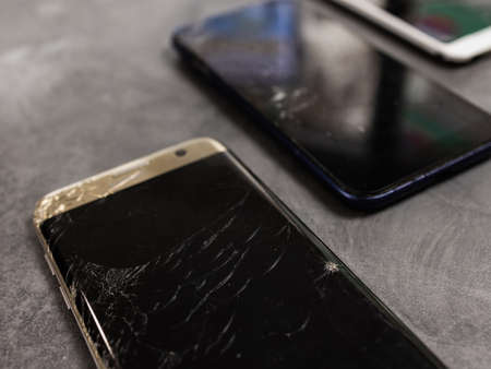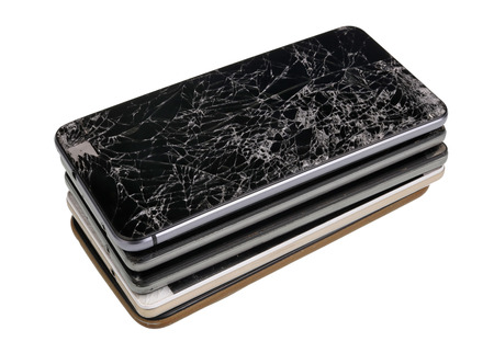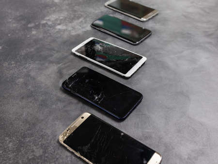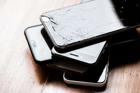 Heap of broken smart phone. Close up at smart phone with cracked screen.