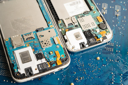 Close up of modern mobile phone repair process chip. Service for restoration and maintenance of smartphones