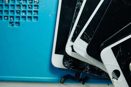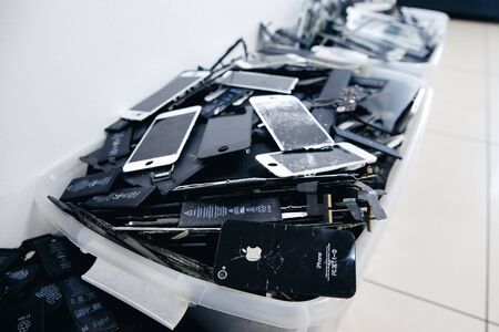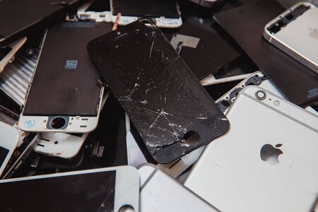 TOMSK, RUSSIA - November 29, 2017: broken panels and screens of iPhone phones lie in the service and are preparing for recycling and disposal