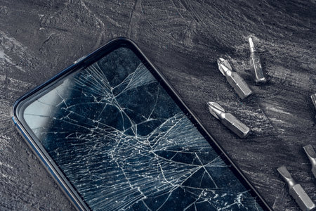 Cell phone with broken cracked lcd display among disassembled gadget AI Generated