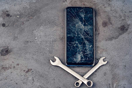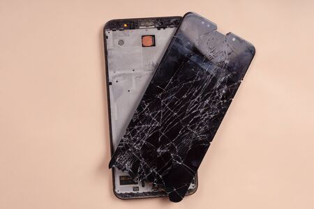 Broken and cracked smartphone screen. A broken smartphone lies on the table before repairing and replacing the monitor. Broken matrix.