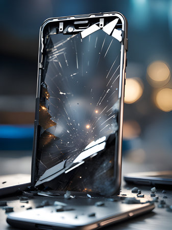 A captivating composition showcasing several broken smartphones with shattered screens arranged in a circular layout against a dark surface.