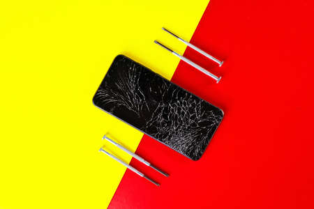 A black smartphone with a cracked display and screwdrivers lies on a red and yellow background. Top view