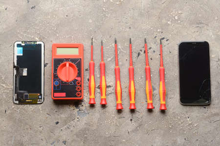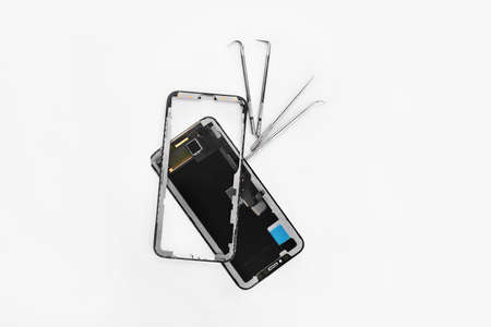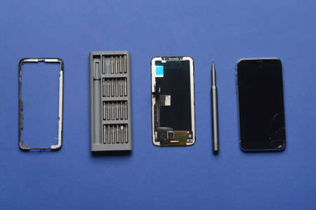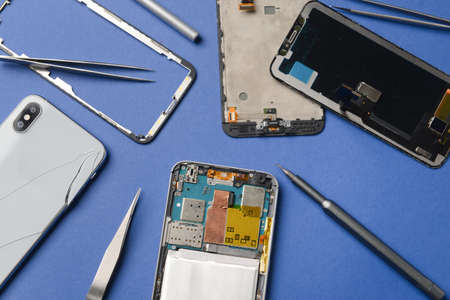 Cell phone repair. Smartphone parts and tools for recovery, selective focus.