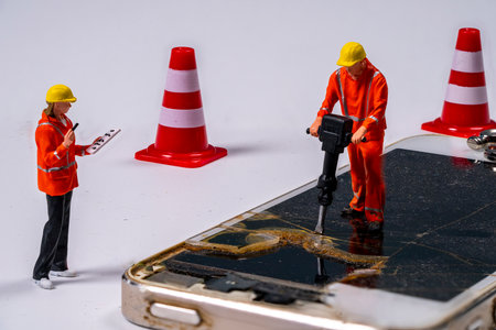 Two miniature construction workers are fixing a broken smartphone. One uses a drill while the other takes notes. Safety cones are in the background.