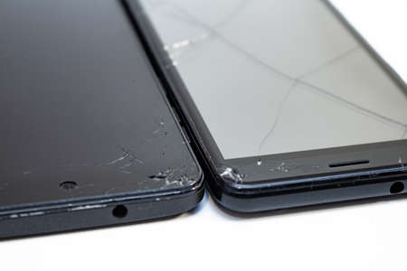Two black phones lie on a white background. The broken smartphone. Cracks on the screen