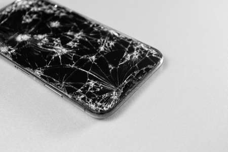 Crashed cellphone display. Broken screen white mobile smartphone with cracked scratches on light background. Close up photography.