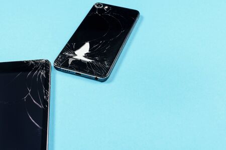 Mobile smartphone the tablet a lot of glass screen damage broken on blue background.