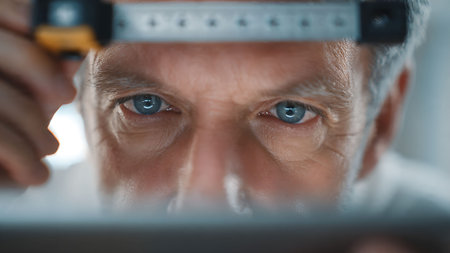Close-up of an engineer with blue eyes using a ruler for precise measurements, showcasing focus and expertise.