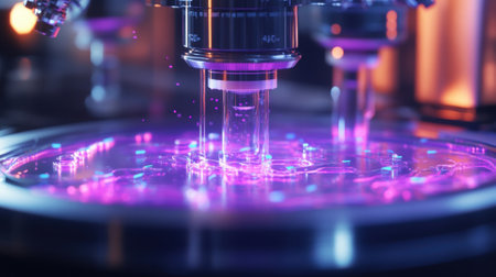 A close-up of an optical engine, with the focus on its glowing purple light emitting from within. The mechanical components around it display intricate designs and textures that give off futuristic vibes. In front is a circular glass disc covered in black plastic, which has a visible holographic pattern. A small droplet tube stands upright above them. This scene creates a sci-fi atmosphere, with neon lighting adding to the overall ambiance. --ar 53:30 --v 6.1 Job ID: 5972e2e0-8c26-40a3-89c4-4b3a29632eea