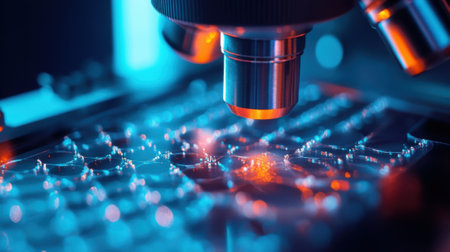 A detailed close-up of a modern optical microscope showcasing intricate lens design and vibrant lighting, perfect for illustrating scientific research and innovation.