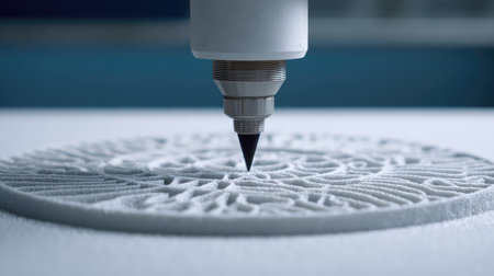 A close-up view of a 3D printing nozzle actively creating detailed patterns on a smooth surface, showcasing modern technology in manufacturing and precision engineering.