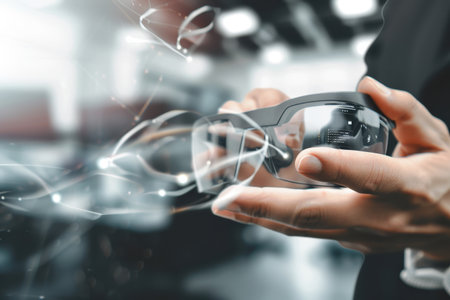 Close-up of smart glasses showing a floating holographic interface. AI-generated.