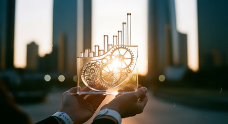A pair of hands holding a transparent 3D model of gears and a bar graph against a city skyline at sunset.