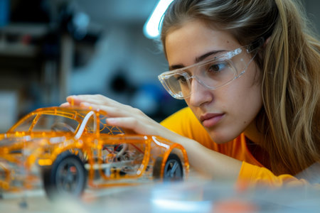 A female Design Engineer develops an innovative high-tech ultramodern eco-friendly electric vehicle according to eco-friendly standards.