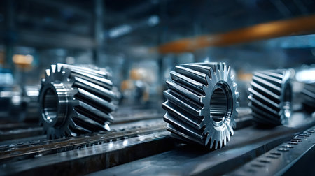 New shiny metal gears are waiting on a conveyor belt in a factory, ready to be assembled into machinery, showcasing industrial manufacturing processes