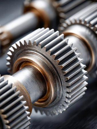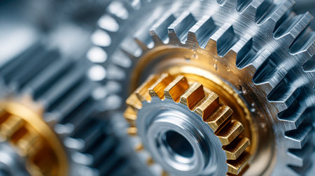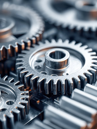 Close-up of intricately meshed steel gears highlighting craftsmanship and advanced mechanical design crucial for high-precision manufacturing systems.