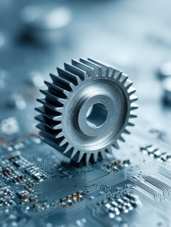A sleek metallic gear merges with an intricate circuit, illustrating the seamless blend of precision mechanics and digital innovation shaping today's tech landscape.