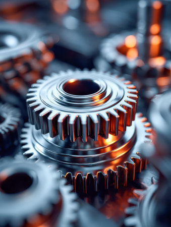 Intricate metallic cogs interlock flawlessly, reflecting light to highlight engineering mastery and the seamless complexity of precision-powered machinery systems.