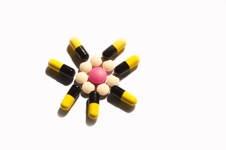 Medication assortment including white tablets and bright colored capsules forming radial pattern background pharmaceutical treatment