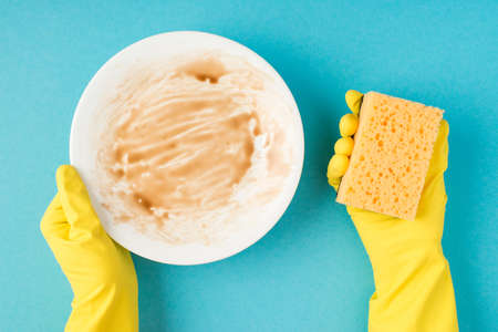 Top view photo of hands in yellow rubber gloves holding dirty plate and scouring pad on isolated pastel blue background