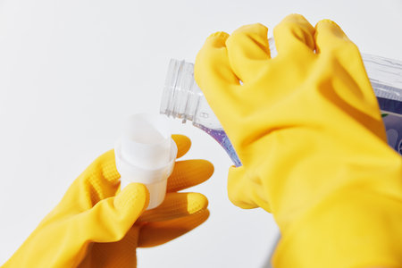 Woman in yellow rubber gloves holding a bottle of cleaning solution and soap
