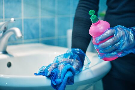 Woman cleaning bathroom sink. Coronavirus prevention measures.
