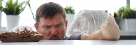 Focus on gloved hand of diligent male touching white office workplace and holding brown loincloth and swiping dust with harmful germs. Pleasant clean-up concept. Blurred background
