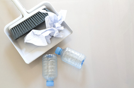 A set for cleaning windows. Hand in a blue glove. Cleaning tools and equipment.