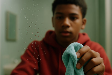 Teenage boy in red hoodie cleaning bathroom mirror with aqua cloth, focused on wiping water droplets on glass surface.