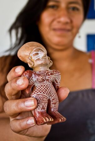 MANABI, ECUADOR - JUNE 4, 2012: Unidentified woman holding ceramic figurine in Agua Blanca Comune Museum in Machalilla National Park.