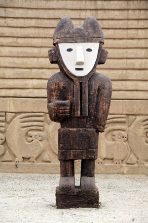 Statue with white face near the wall in Chan Chan, north Peru