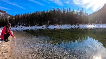 A woman squatting next to a shore of Green Lake in Austrian Alps in winter and taking pictures of crystal clear water, great visibility. Reflections of Alps in calm lake's water. Winter wonderland.