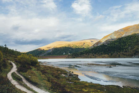 Scenic landscape with shine on mountain lake among grasses and mosses with view to mountain with forest and rocks in autumn sunny day. Beautiful mountain scenery with bright sun on lake water surface.