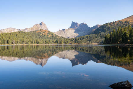 Mountain lake Russia West Siberia Mountain landscape with a lake and forest in the foreground.