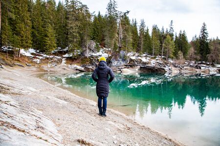 woman watchin amazing turquoise water of Caumasee in winter Switzerland slow travel