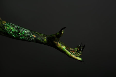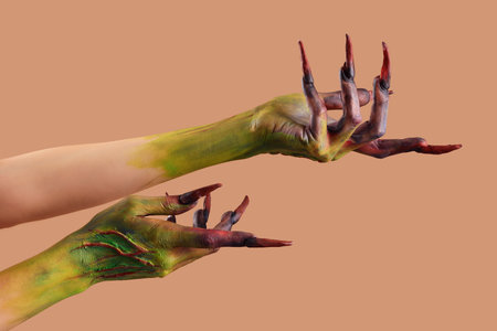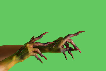 Creepy halloween monster hand in glitter slime and nails touching fingers with female hand, isolated on chroma key green screen background, workspace mockup.