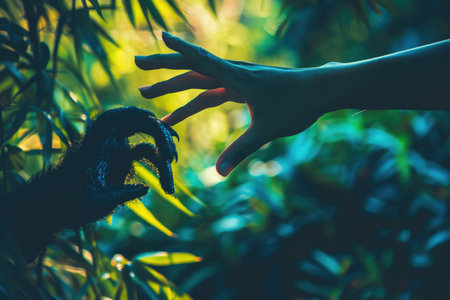 A human hand reaches out to an apes hand in a dense jungle setting. The image is a silhouette, creating a mysterious and intriguing atmosphere.