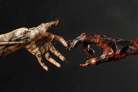 Decaying vampire hand, withered by daylight, reveals a tale of ancient curses and doom. Created with generative AI tools