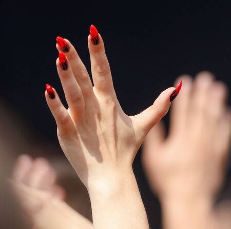 A captivating red hand stretches outward against a moody dark sky, featuring long black nails. This image evokes themes of power, emotion, and artistic expression.