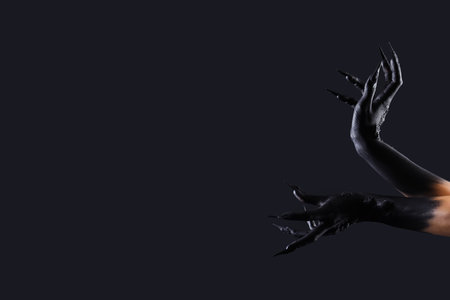 white hands of death with black nails, white death, the devil's hands, the hands of a demon, white skin, halloween theme, black background, isolated studio