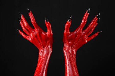 Red Devil's hands, red hands of Satan, Halloween theme, black background, isolated studio