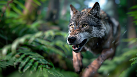 A striking image of a wolf stealthily moving through a vibrant forest underbrush. The scene showcases the beauty of wildlife and nature in motion, emphasizing the wolf's powerful presence and the lush greenery surrounding it, capturing the essence of untamed wilderness.