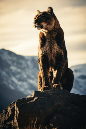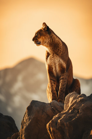 Puma on top of a rock in the mountains at sunset.