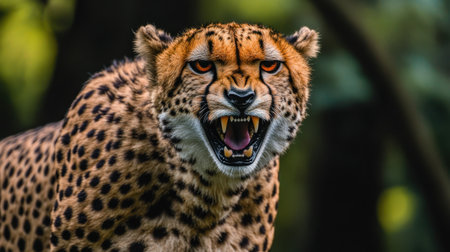 A fierce cheetah captures attention with its intense gaze and bared teeth. The striking pattern of its fur and the energy in this moment portray its role as a powerful predator in the wild.